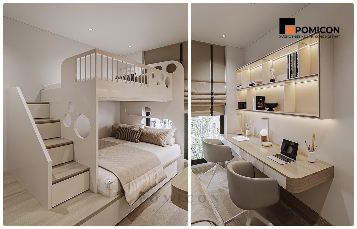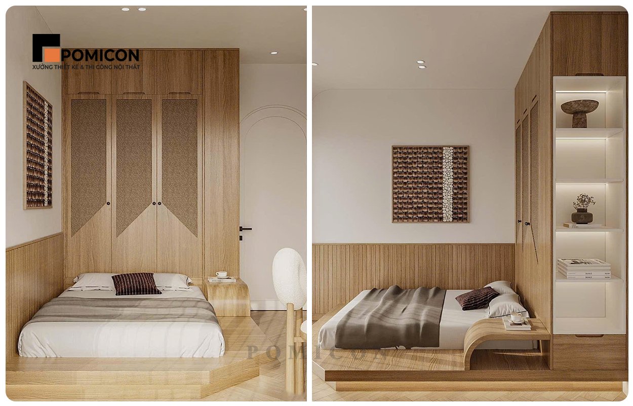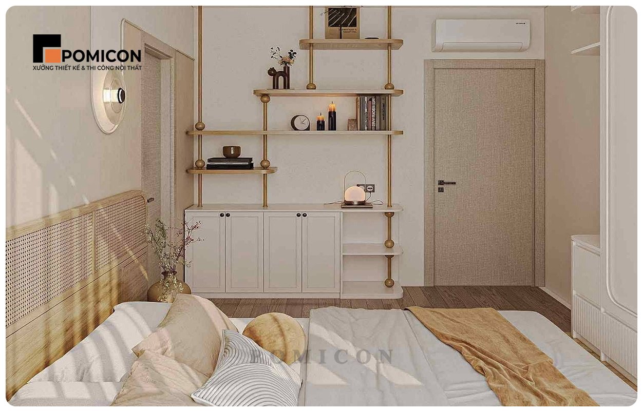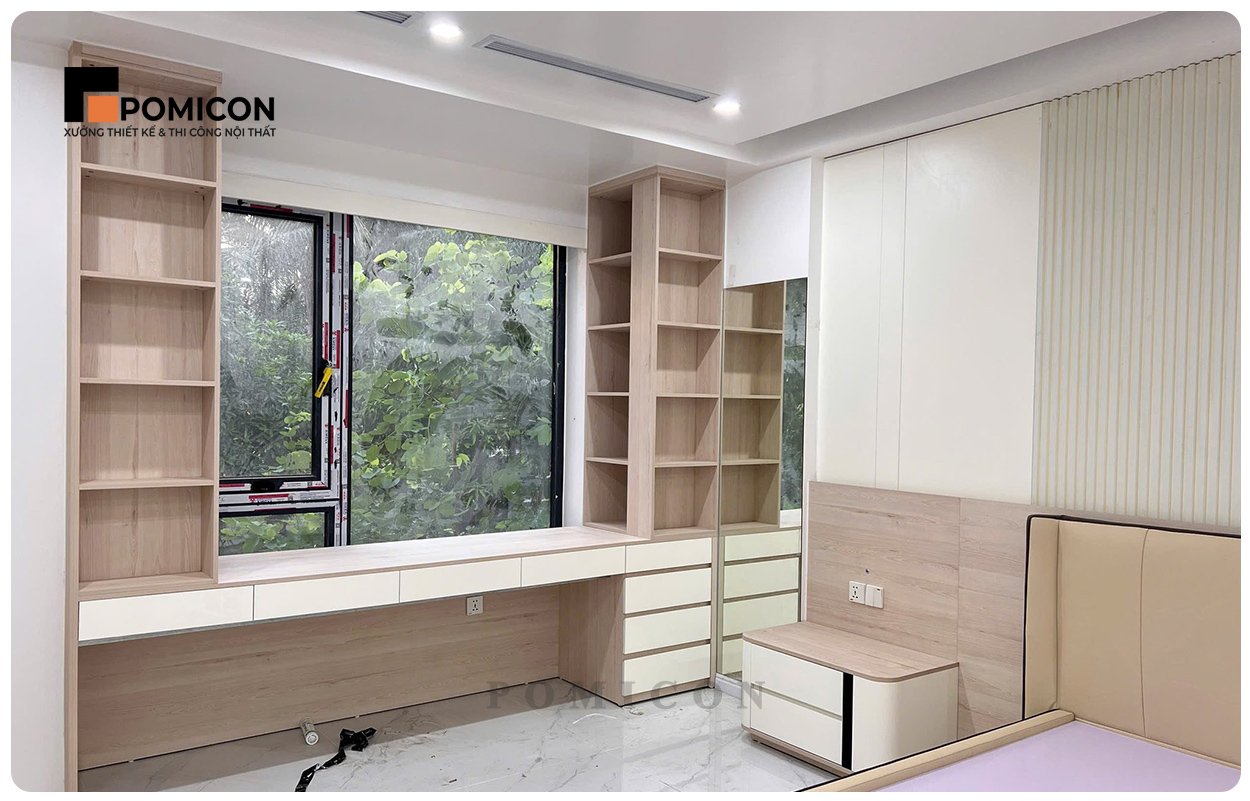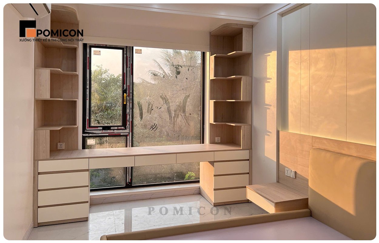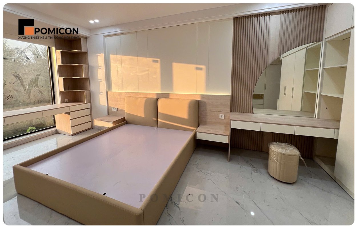 Pomicon thiết kế – thi công các hạng mục chính gồm giường ngủ, tủ quần áo, bàn trang điểm và tab đầu giường bằng gỗ công nghiệp cao cấp. Mỗi sản phẩm được sản xuất theo kích thước chuẩn, phù hợp không gian và nhu cầu sử dụng. Nhờ đó, phòng ngủ trở nên tiện nghi, hài hòa và có tính thẩm mỹ cao.
