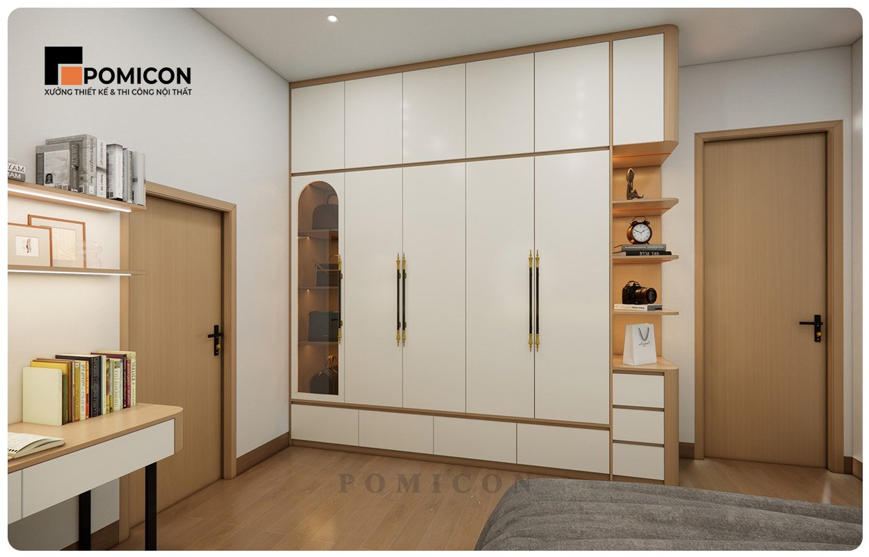 Tủ quần áo được thiết kế cửa lùa, cửa mở hoặc âm tường, tối ưu diện tích và tăng tính thẩm mỹ. Ngăn tủ được phân chia hợp lý, kết hợp với kệ lưu trữ, giúp đồ đạc luôn gọn gàng, dễ sắp xếp và tạo không gian thoáng đãng.
