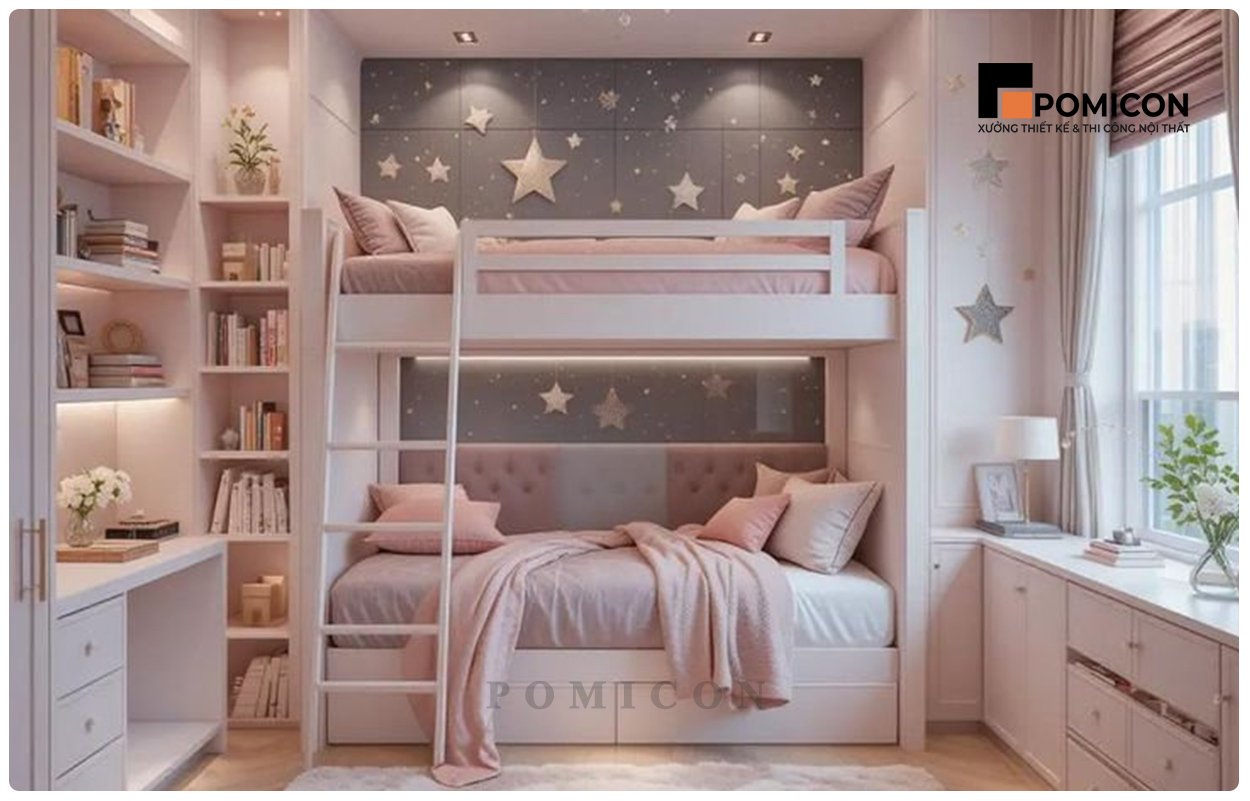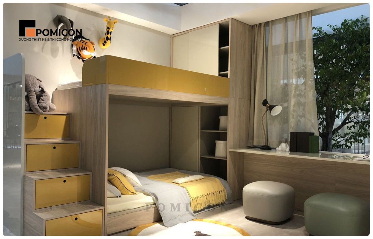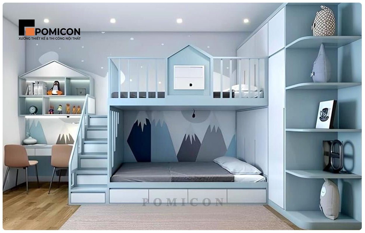 Đặc thù của nhà phố tại Minh Thạnh là diện tích không quá lớn, do đó thiết kế thông minh là giải pháp tối ưu. POMICON tận dụng không gian bằng giường tầng, tủ âm tường, bàn học tích hợp giá sách hoặc tủ kéo dưới gầm giường. Nhờ đó, phòng vừa gọn gàng vừa tiện nghi, giúp bé dễ dàng di chuyển và sử dụng đồ đạc an toàn.