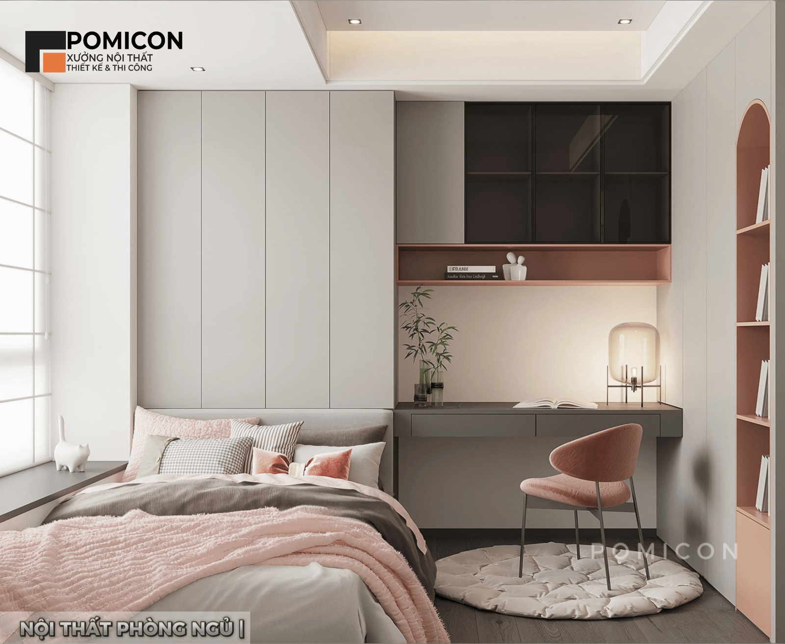 POMICON chú trọng yếu tố an toàn, màu sắc hài hòa và công năng học tập. Các hạng mục như giường ngủ, bàn học, tủ đồ được bố trí khoa học, giúp bé vừa học tập vừa vui chơi trong không gian thoải mái.