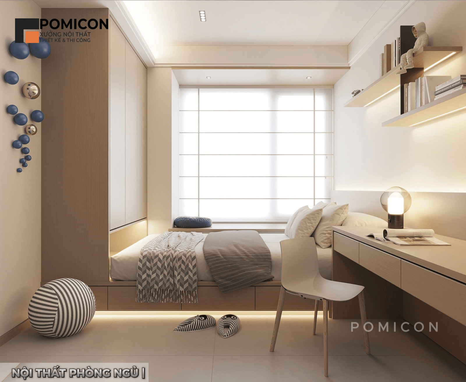 POMICON chú trọng yếu tố an toàn, màu sắc hài hòa và công năng học tập. Các hạng mục như giường ngủ, bàn học, tủ đồ được bố trí khoa học, giúp bé vừa học tập vừa vui chơi trong không gian thoải mái.