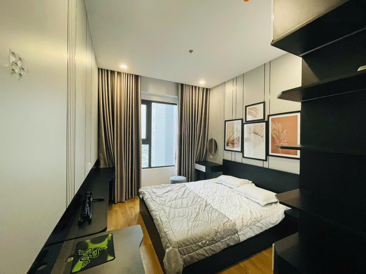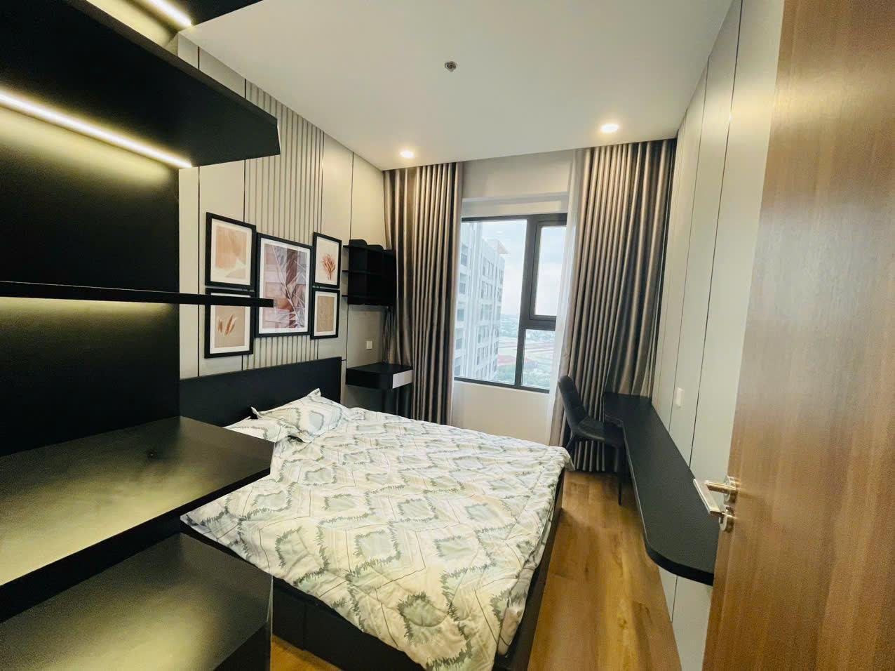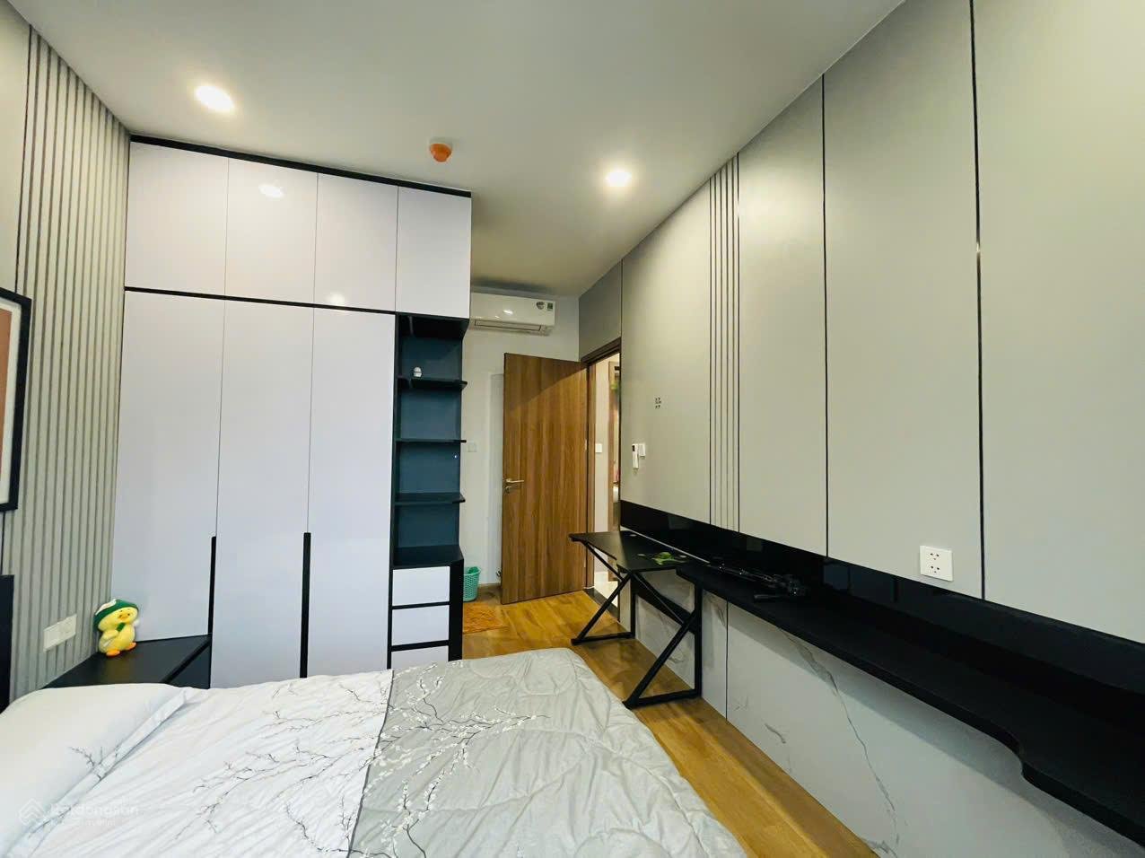 Phòng ngủ căn hộ chung cư The Rivana được thi công với giường ngủ, tủ quần áo kịch trần và bàn trang điểm.