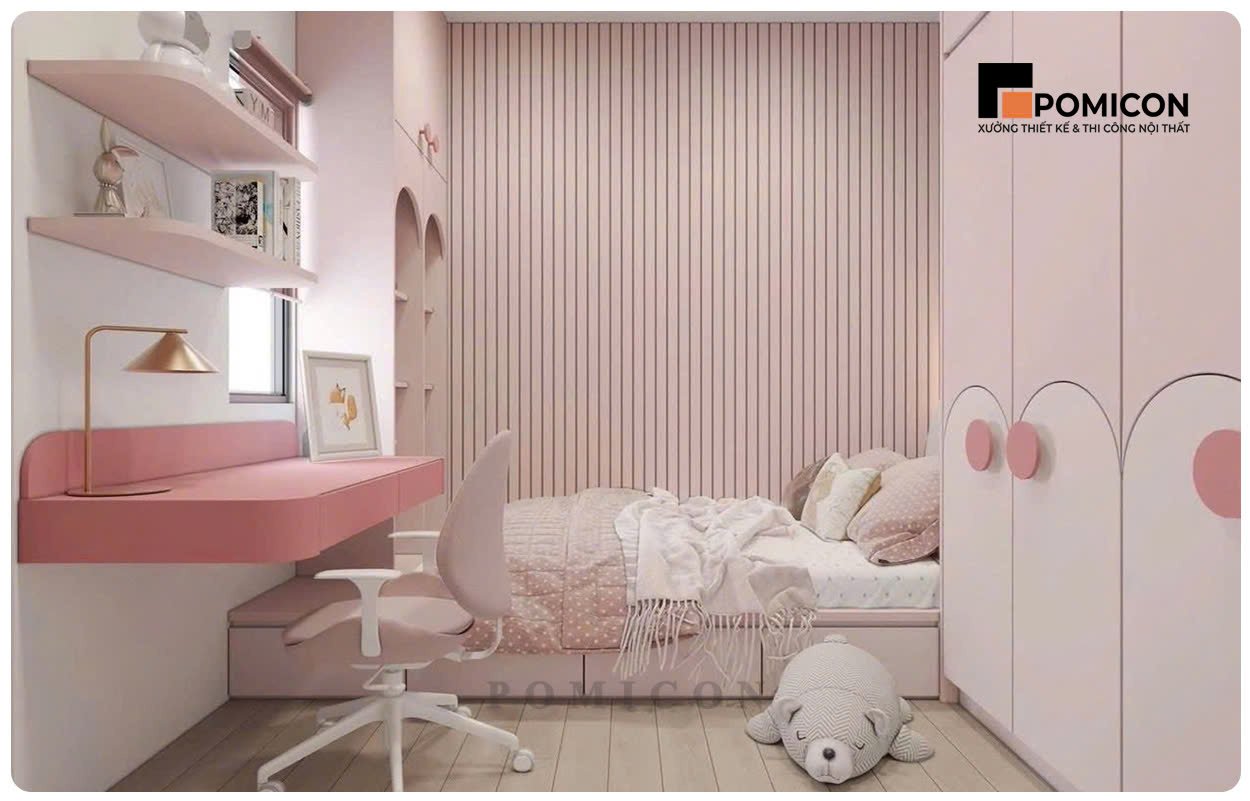 Phòng cho bé được thiết kế phù hợp với từng độ tuổi và nhu cầu sử dụng. POMICON chú trọng yếu tố an toàn, màu sắc hài hòa và công năng học tập. Các hạng mục như giường ngủ, bàn học và tủ đồ được bố trí khoa học. Không gian giúp bé thoải mái sinh hoạt và phát triển toàn diện. Phòng cho bé vừa học tập vừa vui chơi hiệu quả.