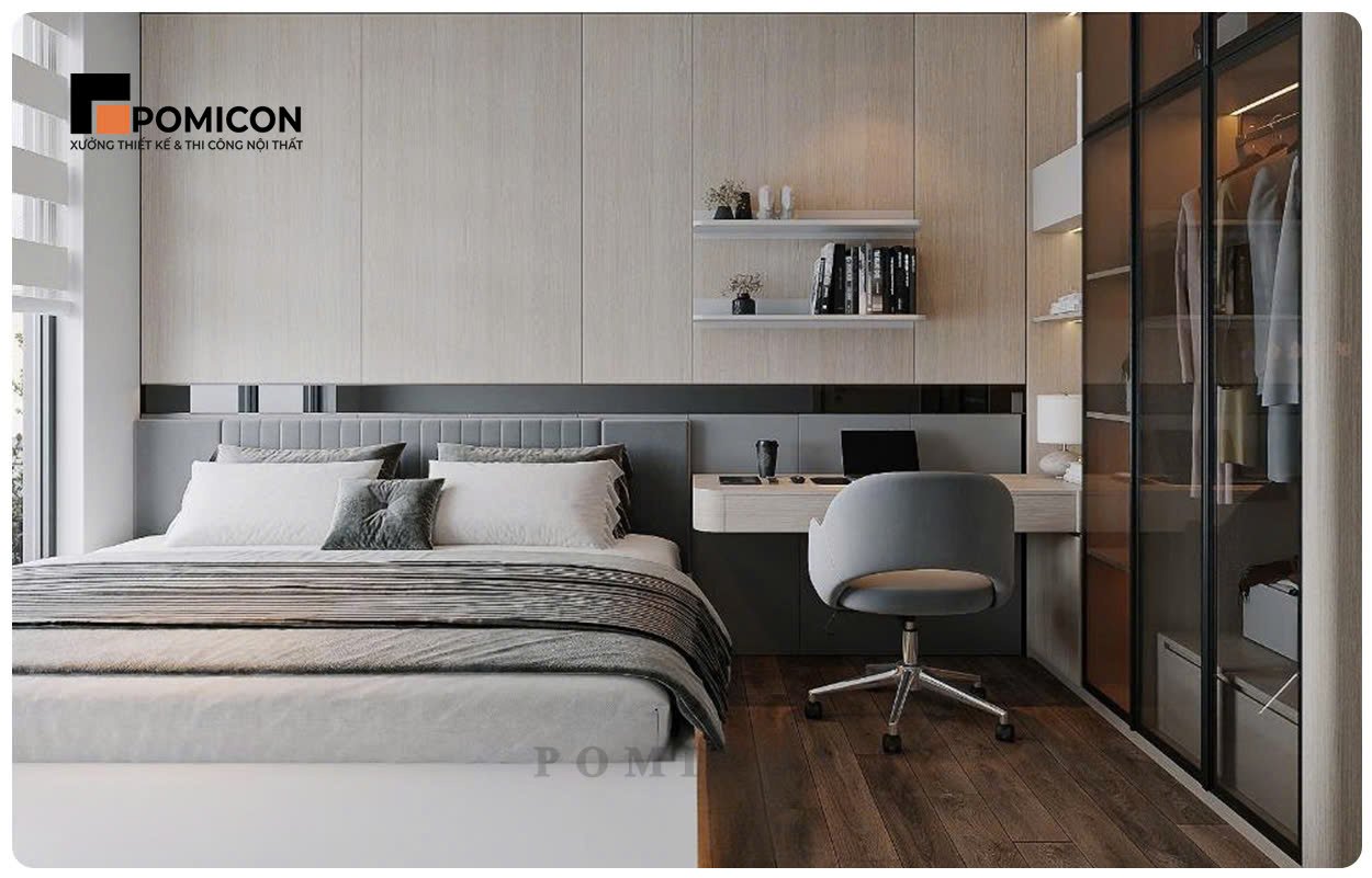 POMICON thi công phòng ngủ với giường ngủ, tủ quần áo kịch trần và bàn trang điểm. Thiết kế tập trung vào sự thoải mái, riêng tư và tối ưu lưu trữ. Các chi tiết được tính toán kỹ để tận dụng tối đa diện tích sử dụng. Vật liệu bền đẹp, phù hợp cho nhu cầu lâu dài. Không gian phòng ngủ mang lại cảm giác thư giãn cho gia chủ.