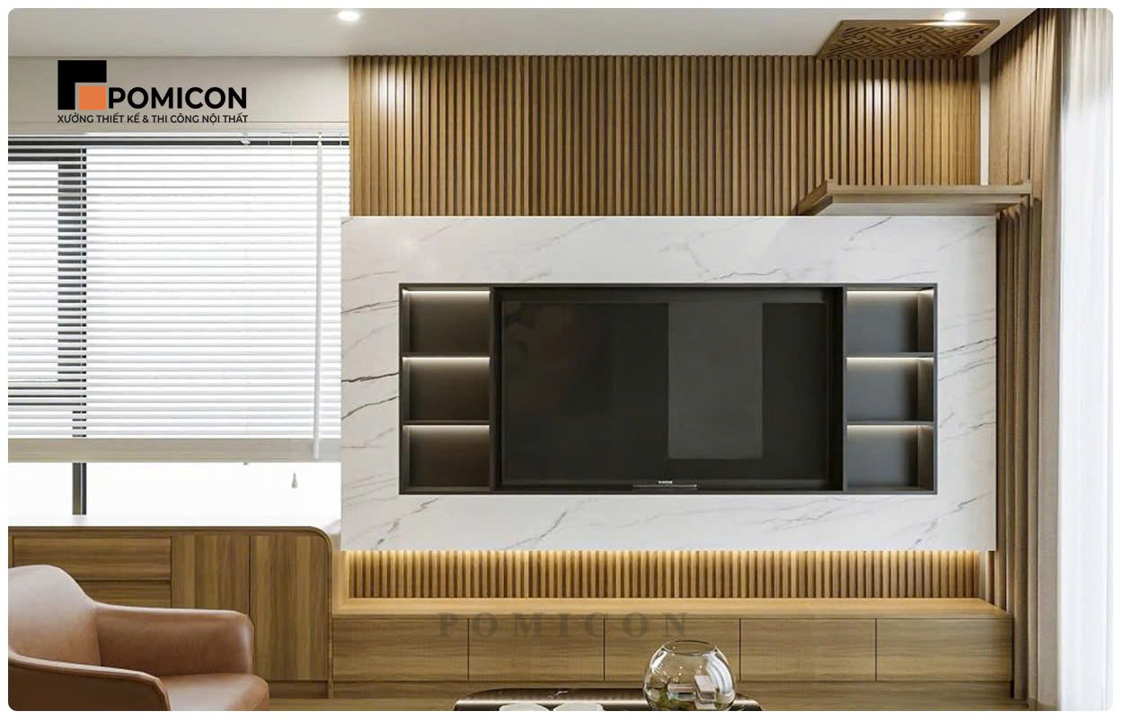 Phòng khách được POMICON thi công với vách kệ tivi, tủ giày và hệ trang trí hiện đại. Bố cục không gian được sắp xếp hợp lý nhằm tạo cảm giác rộng rãi và thông thoáng. Nội thất được sản xuất trực tiếp tại xưởng giúp đảm bảo độ chính xác cao khi lắp đặt. Màu sắc và vật liệu được lựa chọn hài hòa với tổng thể ngôi nhà. Phòng khách trở thành điểm nhấn chính của không gian sống.