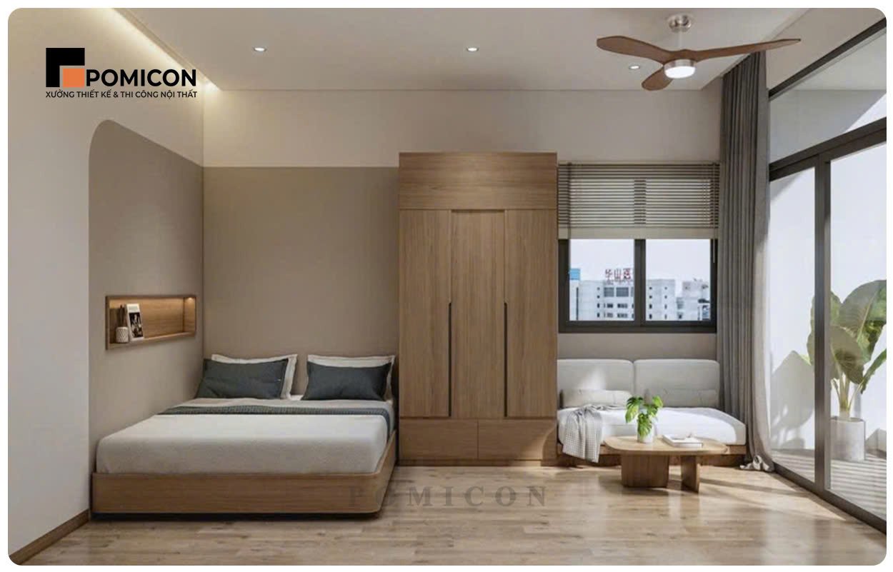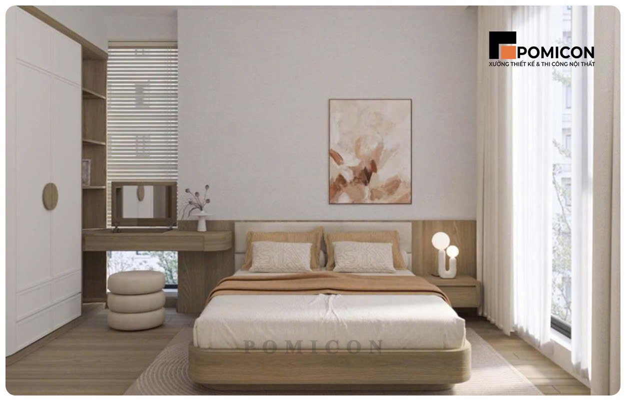 POMICON thi công phòng ngủ với giường ngủ, tủ quần áo kịch trần và bàn trang điểm. Thiết kế tập trung vào sự thoải mái, riêng tư và tối ưu lưu trữ. Các chi tiết được tính toán kỹ để tận dụng tối đa diện tích sử dụng. Vật liệu bền đẹp, phù hợp cho nhu cầu lâu dài. Không gian phòng ngủ mang lại cảm giác thư giãn cho gia chủ.