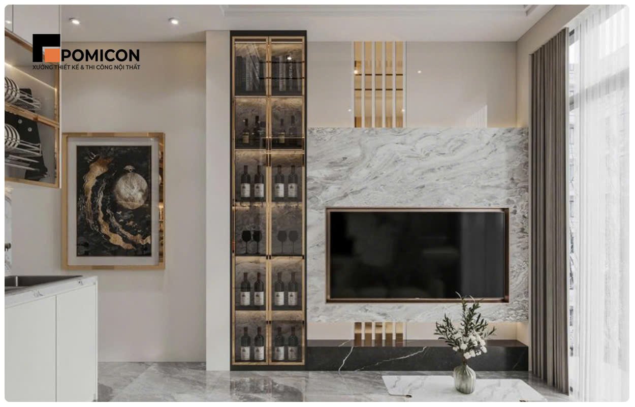 Phòng khách được POMICON thi công với vách kệ tivi, tủ giày và hệ trang trí hiện đại. Bố cục không gian được sắp xếp hợp lý nhằm tạo cảm giác rộng rãi và thông thoáng. Nội thất được sản xuất trực tiếp tại xưởng giúp đảm bảo độ chính xác cao khi lắp đặt. Màu sắc và vật liệu được lựa chọn hài hòa với tổng thể ngôi nhà. Phòng khách trở thành điểm nhấn chính của không gian sống.