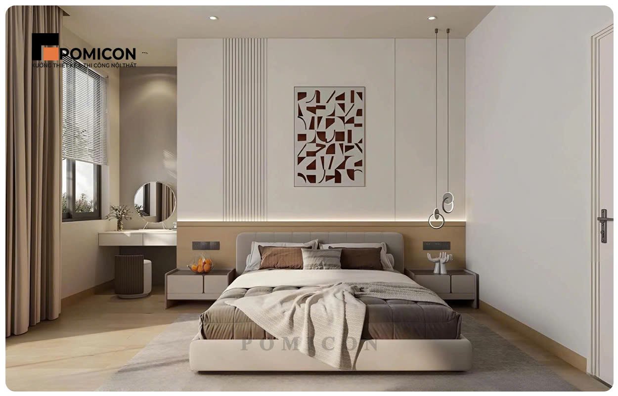 POMICON thi công phòng ngủ với giường ngủ, tủ quần áo kịch trần và bàn trang điểm. Thiết kế tập trung vào sự thoải mái, riêng tư và tối ưu lưu trữ. Các chi tiết được tính toán kỹ để tận dụng tối đa diện tích sử dụng. Vật liệu bền đẹp, phù hợp cho nhu cầu lâu dài. Không gian phòng ngủ mang lại cảm giác thư giãn cho gia chủ.