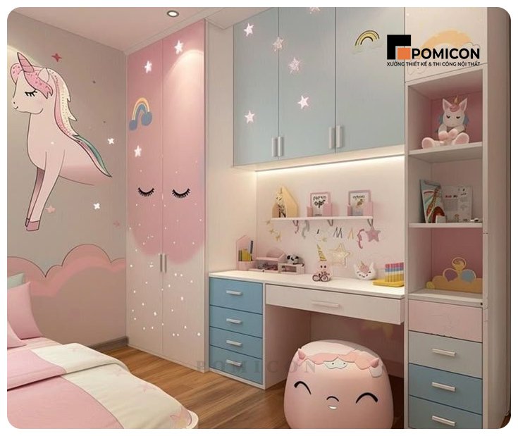 Phòng cho bé được thiết kế phù hợp với từng độ tuổi và nhu cầu sử dụng. POMICON chú trọng yếu tố an toàn, màu sắc hài hòa và công năng học tập. Các hạng mục như giường ngủ, bàn học và tủ đồ được bố trí khoa học. Không gian giúp bé thoải mái sinh hoạt và phát triển toàn diện. Phòng cho bé vừa học tập vừa vui chơi hiệu quả.