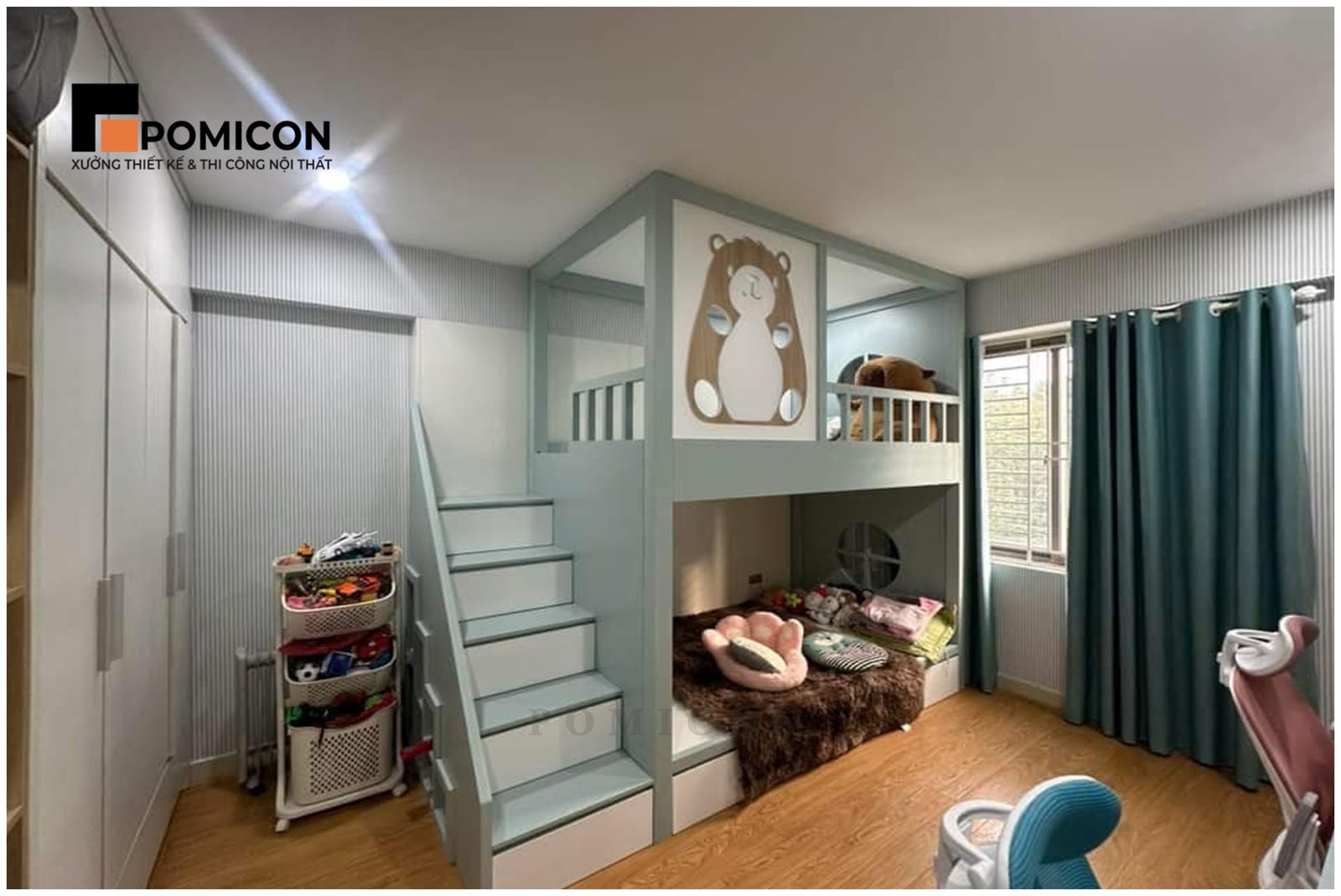 Phòng cho bé được thiết kế phù hợp với từng độ tuổi và nhu cầu sử dụng. POMICON chú trọng yếu tố an toàn, màu sắc hài hòa và công năng học tập. Các hạng mục như giường ngủ, bàn học và tủ đồ được bố trí khoa học. Không gian giúp bé thoải mái sinh hoạt và phát triển toàn diện. Phòng cho bé vừa học tập vừa vui chơi hiệu quả.